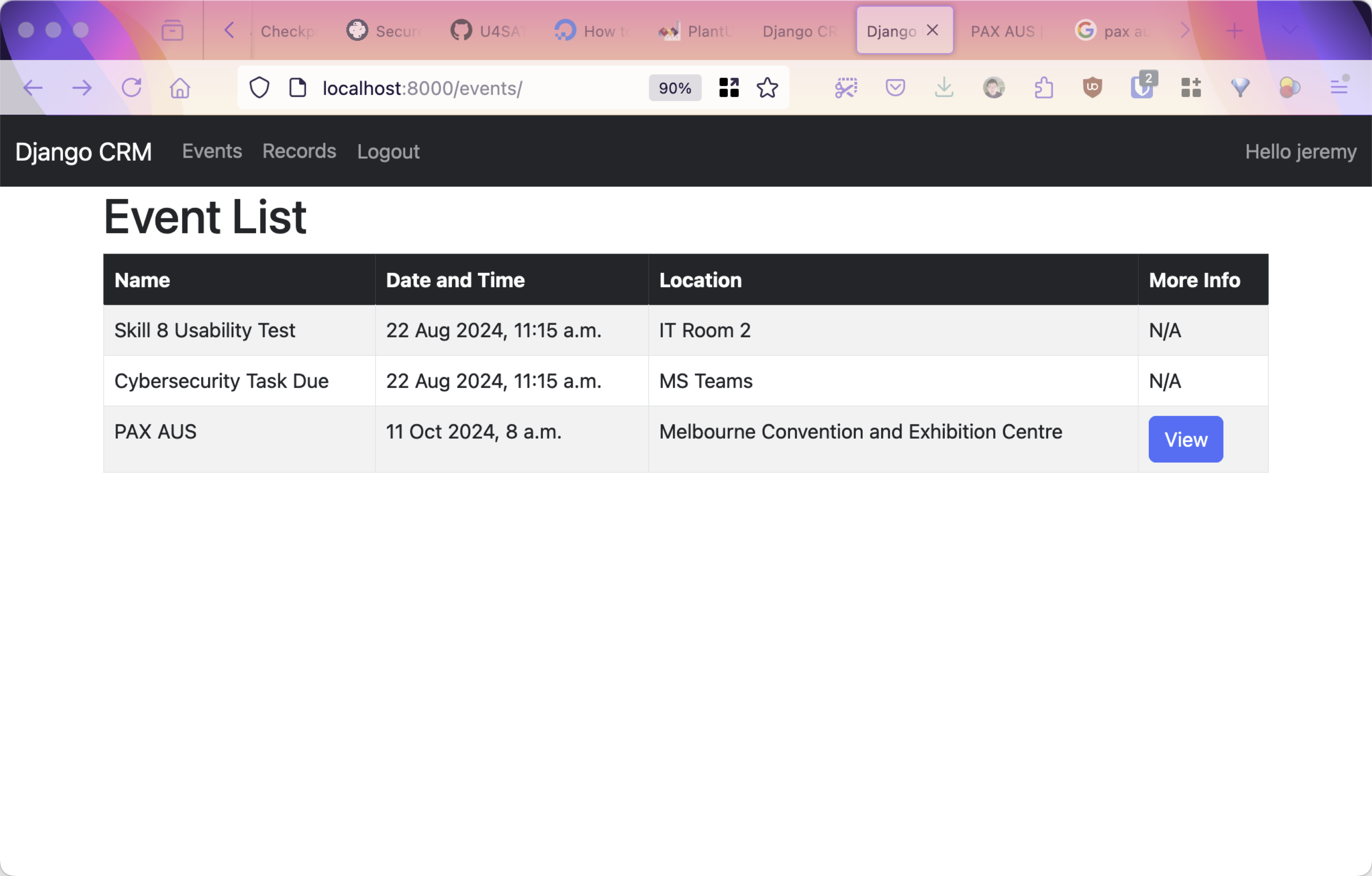return render(request, 'crm/event_list.html', {"events": events})Event List Template